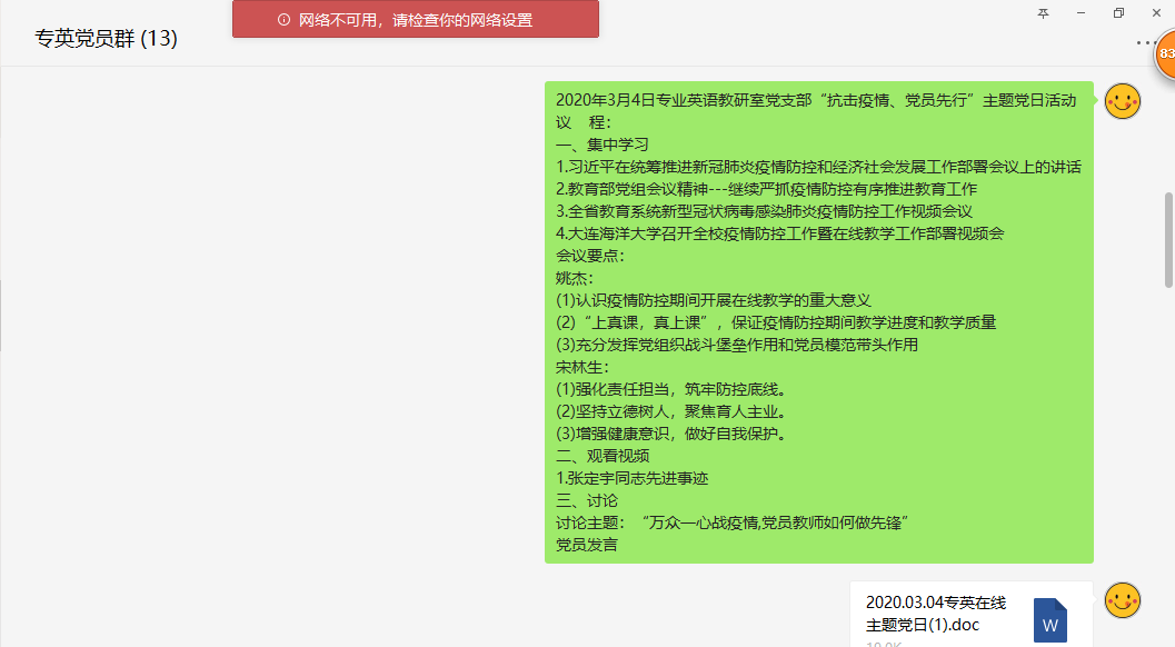 疫情发生以来,教工支部党员积极宣传、科学防控,在落实教师健康情况监测工作的同时,定期在学院微信公众号推送双语版“总书记说”;撰写咨政建议2篇;积极响应教育部“停课不停教”的号召,全身心投入到线上教学准备工作;建立课程学习群,引导学生相信党和政府的决策,相信科学,不信谣不传谣,切实做好自己和家人的防护工作;指导学生利用优质在线教育资源加强自主学习、探究式学习,使学生在做好疫情防控的同时,也能够加强学习,不断提高完善自己。