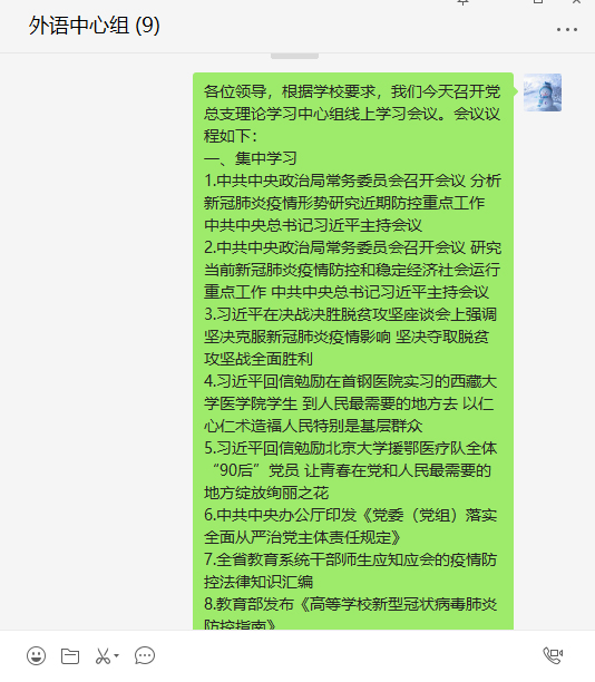 会议学习了中央“新型冠状病毒感染的肺炎疫情防控工作”主要会议精神、习近平总书记近期重要讲话精神、中共中央办公厅印发的《党委(党组)落实全面从严治党主体责任规定》、全省教育系统干部师生应知应会的疫情防控法律知识汇编、教育部发布的《高等学校新型冠状病毒肺炎防控指南》。