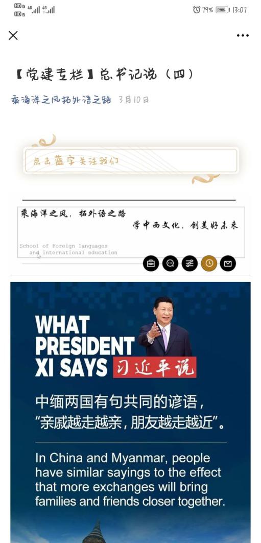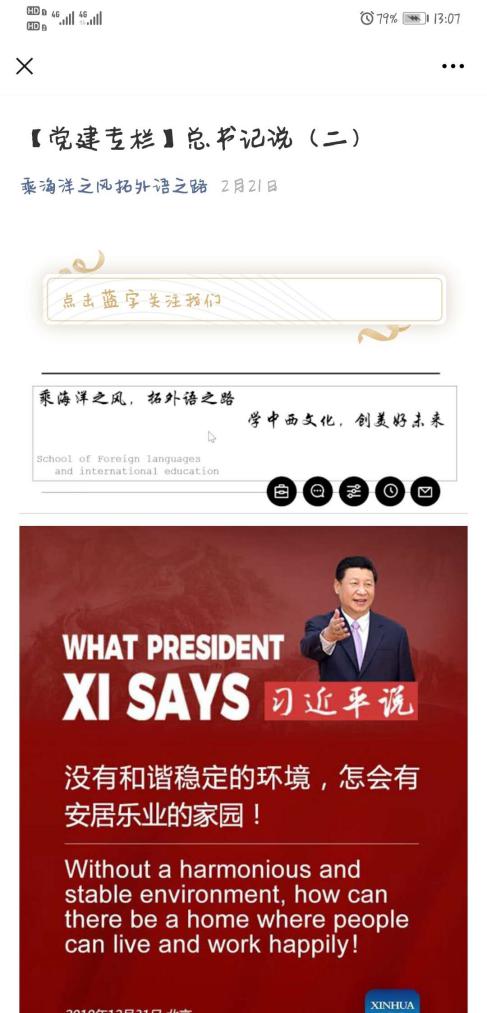 活动以学院微信公众号定期推送中英双语解读《总书记说》、中日双语疫情防控系列文章等形式开展。活动旨在强化学生专业知识学习的同时,大力宣传习近平总书记系列重要讲话精神以及党中央关于疫情防控的决策部署,彰显抗疫过程中的中国特色社会主义制度的优越性,激发广大师生爱党、爱国、爱社会主义的巨大热情,坚定万众一心、抗疫必胜的信念和决心。
